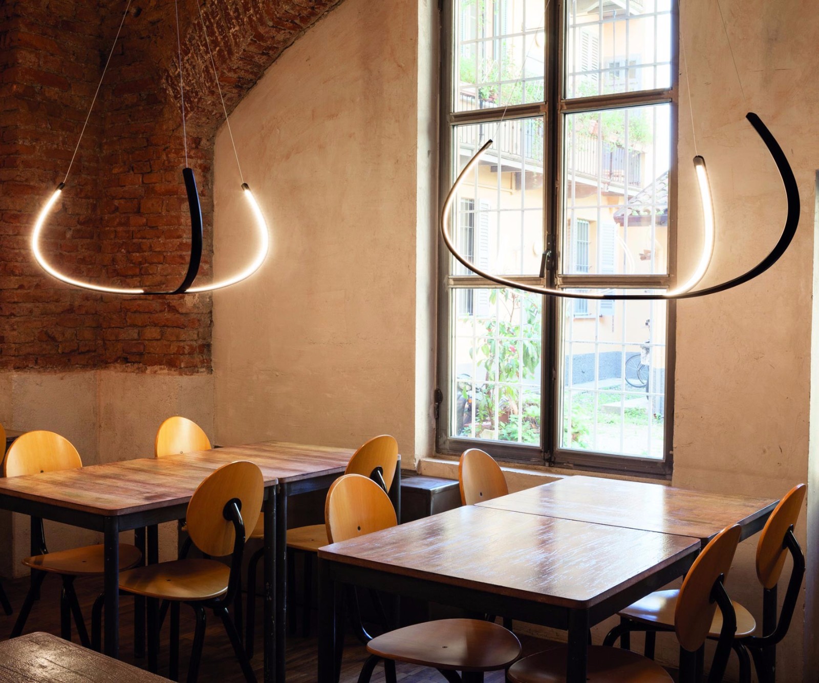 對于特殊材質的靈活運用,NEMO的設計師將燈具制成各種形狀,這像呼啦圈的燈具增大了照明范圍的同時,也美化了空間,可謂是一舉兩得。