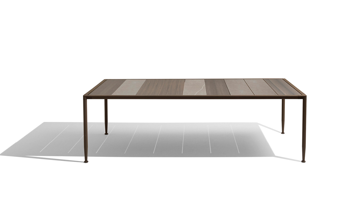 GIORGETTI BIGWIG,這款桌子的設(shè)計來自于意大利知名設(shè)計師羅伯特·拉澤羅尼,Tycoon以胡桃木為原料,鏤空出幾個矩形后用灰色鋼化玻璃或大理石嵌入,桌角用覆蓋著皮革的胡桃木桌腿和古銅膚色的腳帽,營造一種高級感。