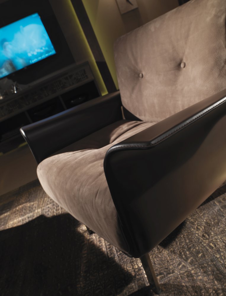 COVRE的制作工藝十分的精致,單從這張休閑椅上來看,布料與皮革相互交替的十分平整光滑,看不出任何褶皺的痕跡。
