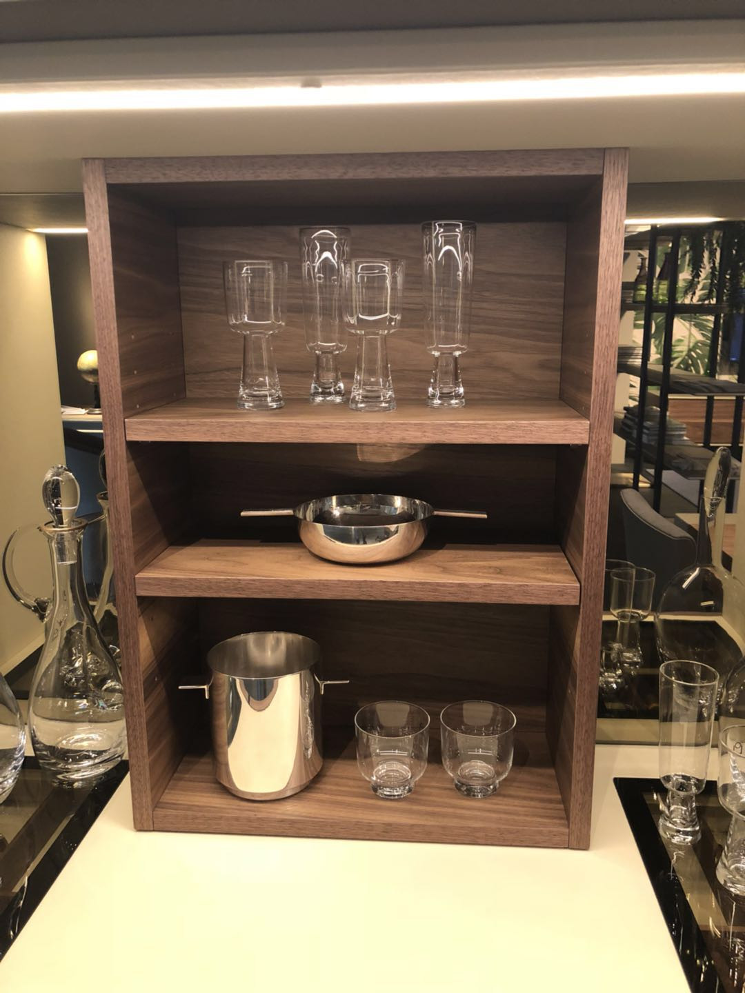 弧形的柜門打開后,內部是雙層擺放空間,可擺放各種酒杯等。整個柜體里里外外都用奶白色皮革所包裹,搭配金屬外扣裝飾,使設計簡單的同時又不落俗套。