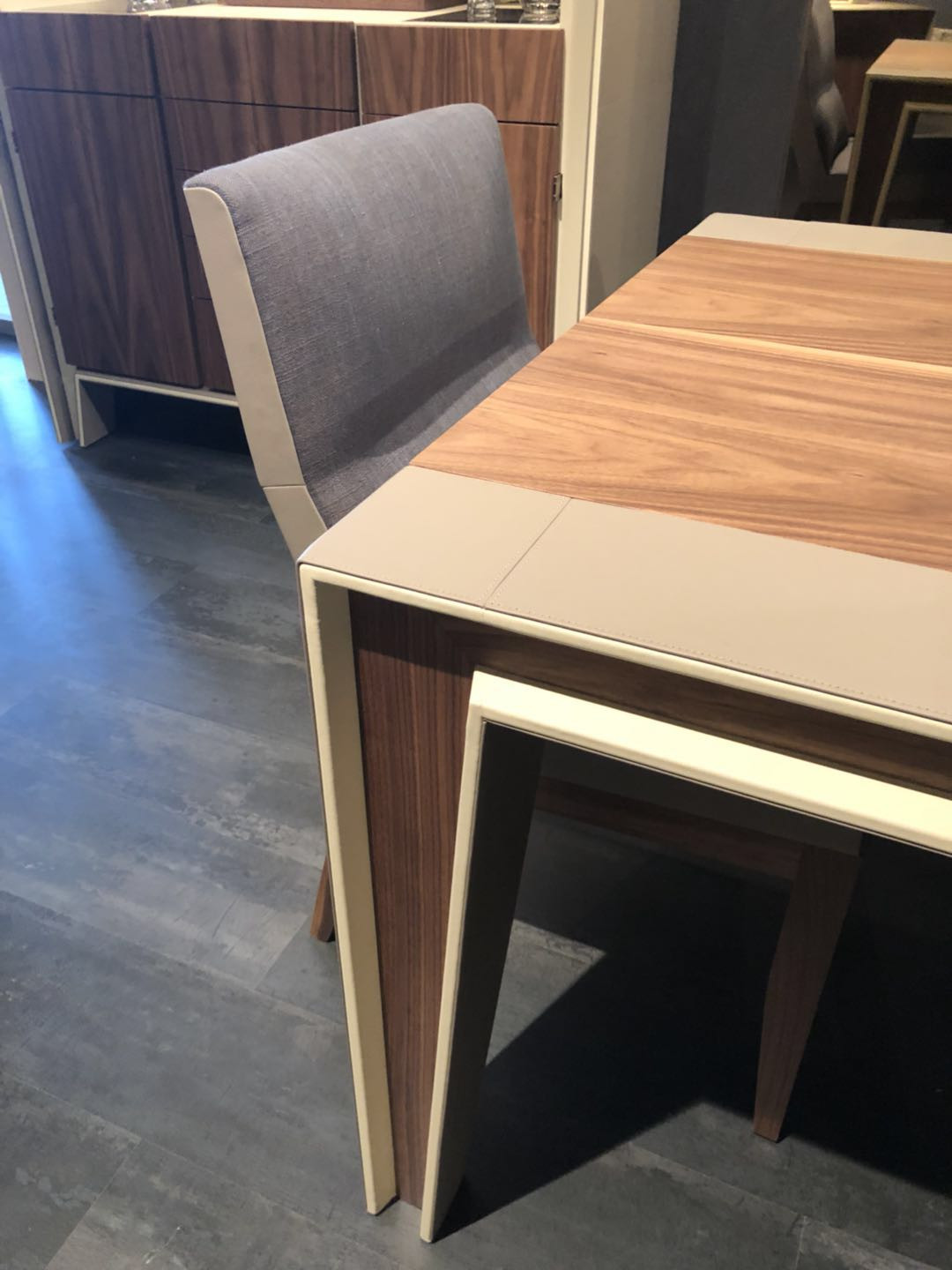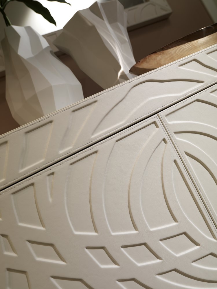 皮革與木料之間不同品種的紋理碰撞,光滑亮麗的皮革搭配富有紋理的木材,搭配白色的皮質椅子,優雅盡顯。