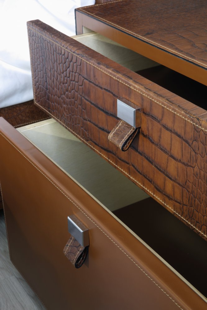 以下這款邊柜就是由他們所設計,圓筒形的小型邊柜擺放在沙發邊,柜面被設計成了一汪湖水,一艘由高端皮革做成的小船正靜靜的立在“湖面”上。
