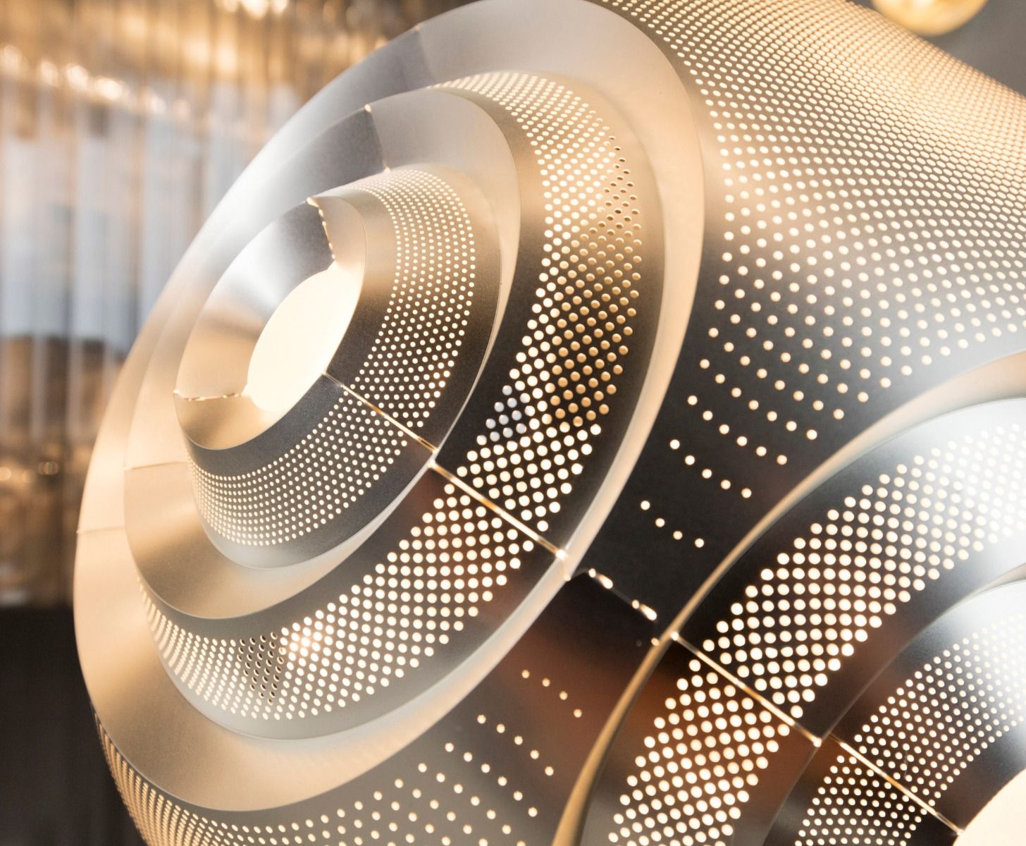 每個吊燈的鏡面拋光是由高度技術化的真空金屬工藝創造的,聚碳酸酯外殼分泌在金屬內部,空氣被吸出,并由巨大的電荷通過,薄薄的銅箔被氣化成細霧,用真空薄膜沉積到一個新的水平與金屬表面,創造一個非凡的光學效果。