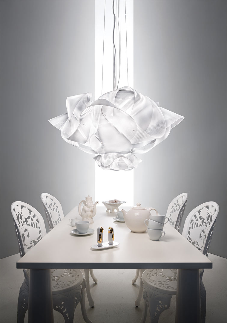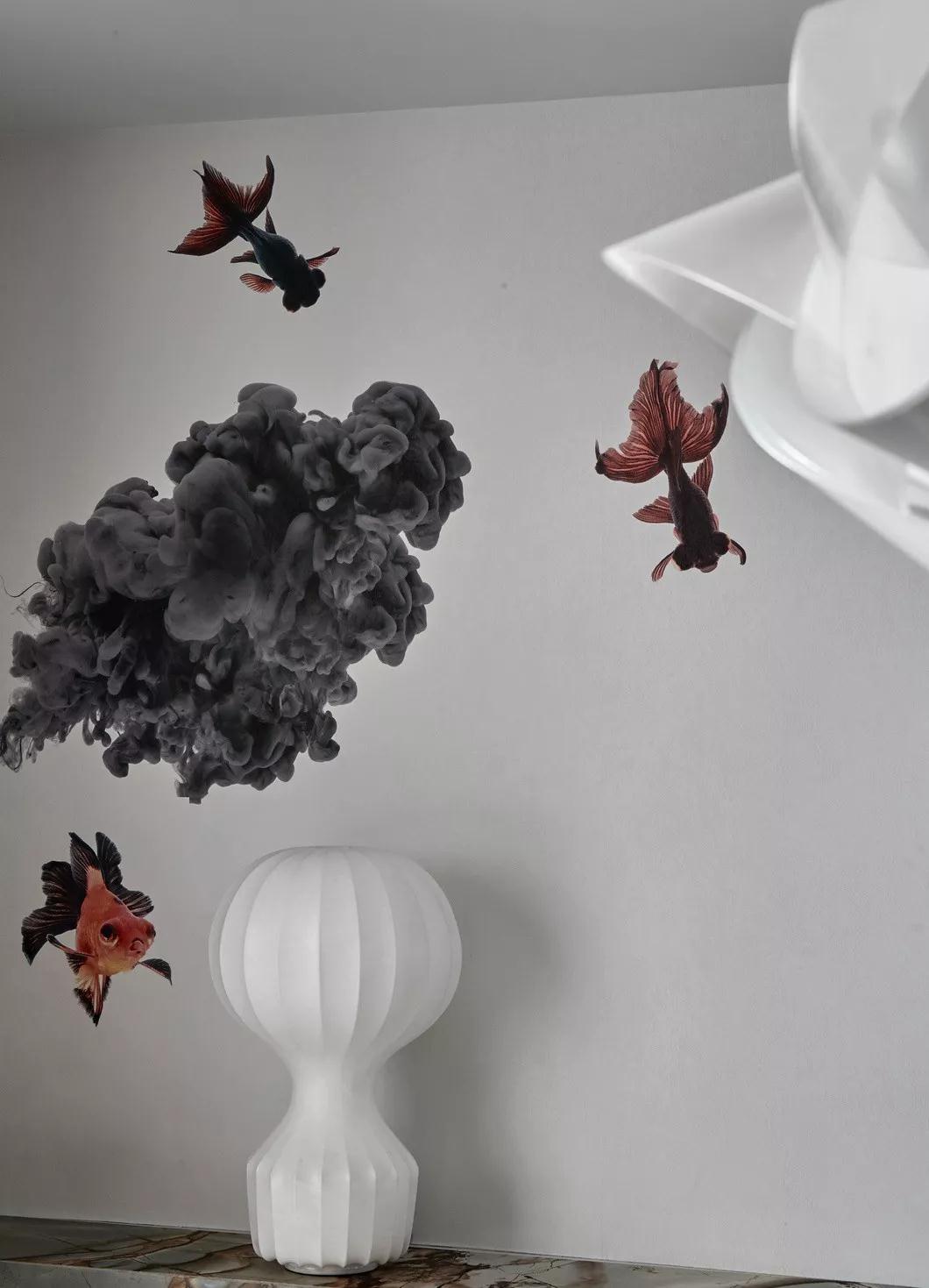 餐廳是家人齊聚時交流談心 共進美食的區(qū)域,男主人對魚情有獨鐘,因此在餐廳墻上游戲著各式各樣的小金魚,而餐廳上方Slamp Fabula 系列的吊燈和魚兒嬉戲的場景相得益彰。