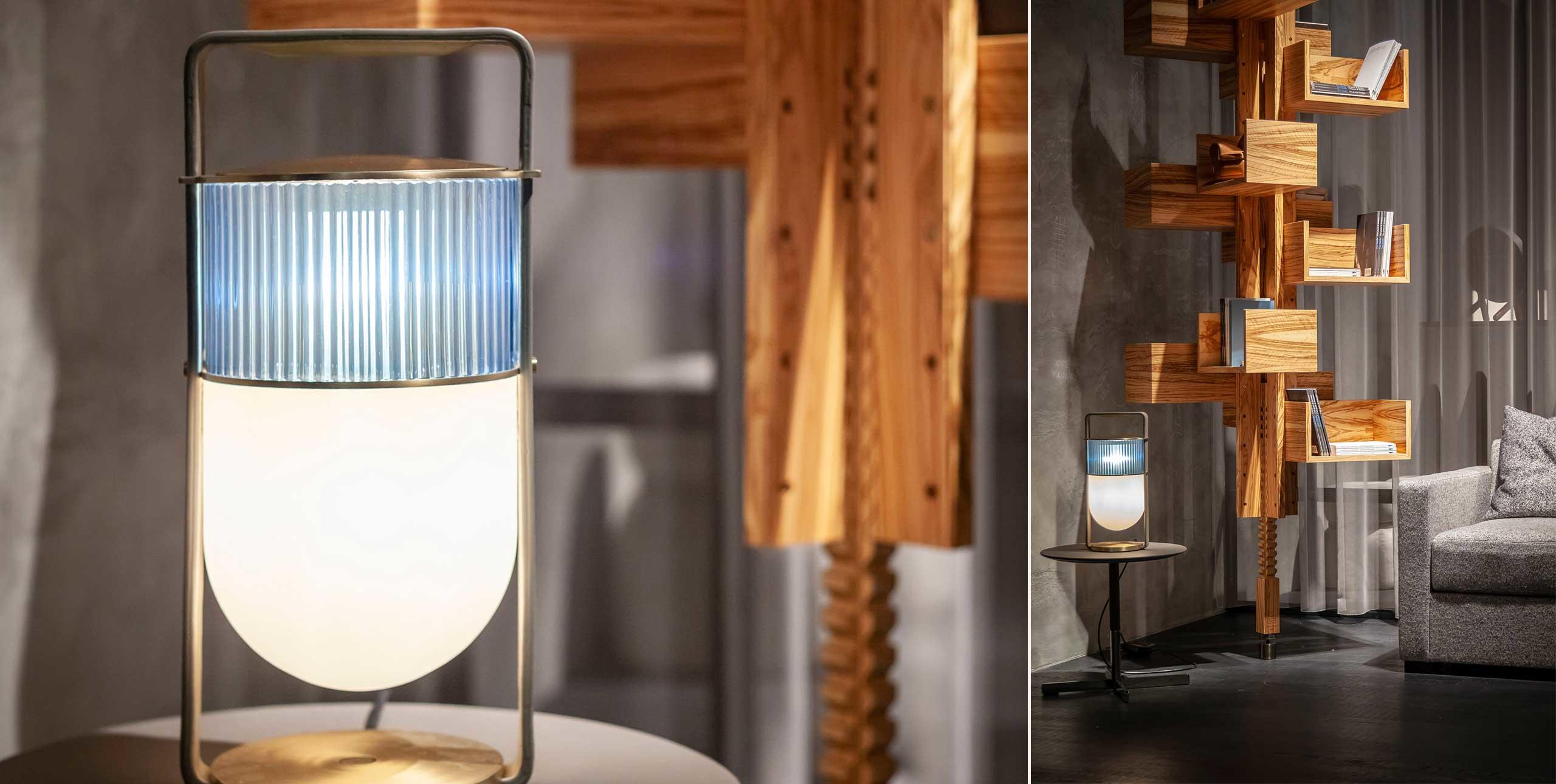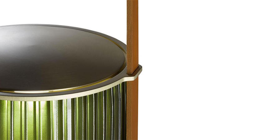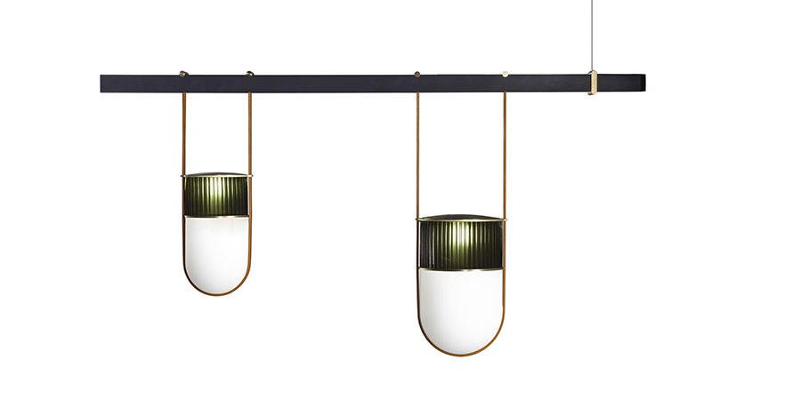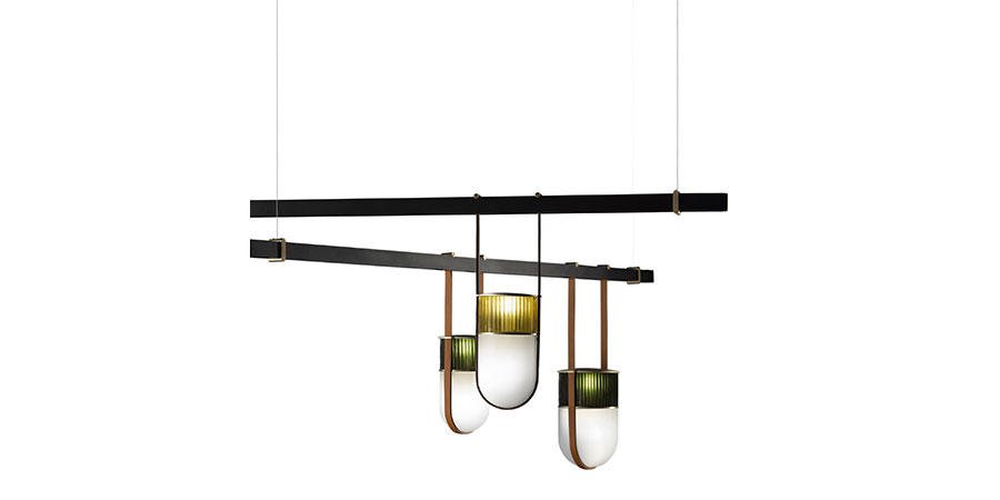 吹制的玻璃和馬鞍皮制成的燈線就像燈籠一般,使燈具的整體造型如純凈的線條和精致的材料對比,將吹制玻璃的兩種元素結(jié)合在一起,上部玻璃有一個特別均勻的表面,是透明的陰影琥珀(祖母綠、藍寶石或月亮石),下半部分由一部分珍珠制成,只為讓光線更溫暖更加發(fā)散!