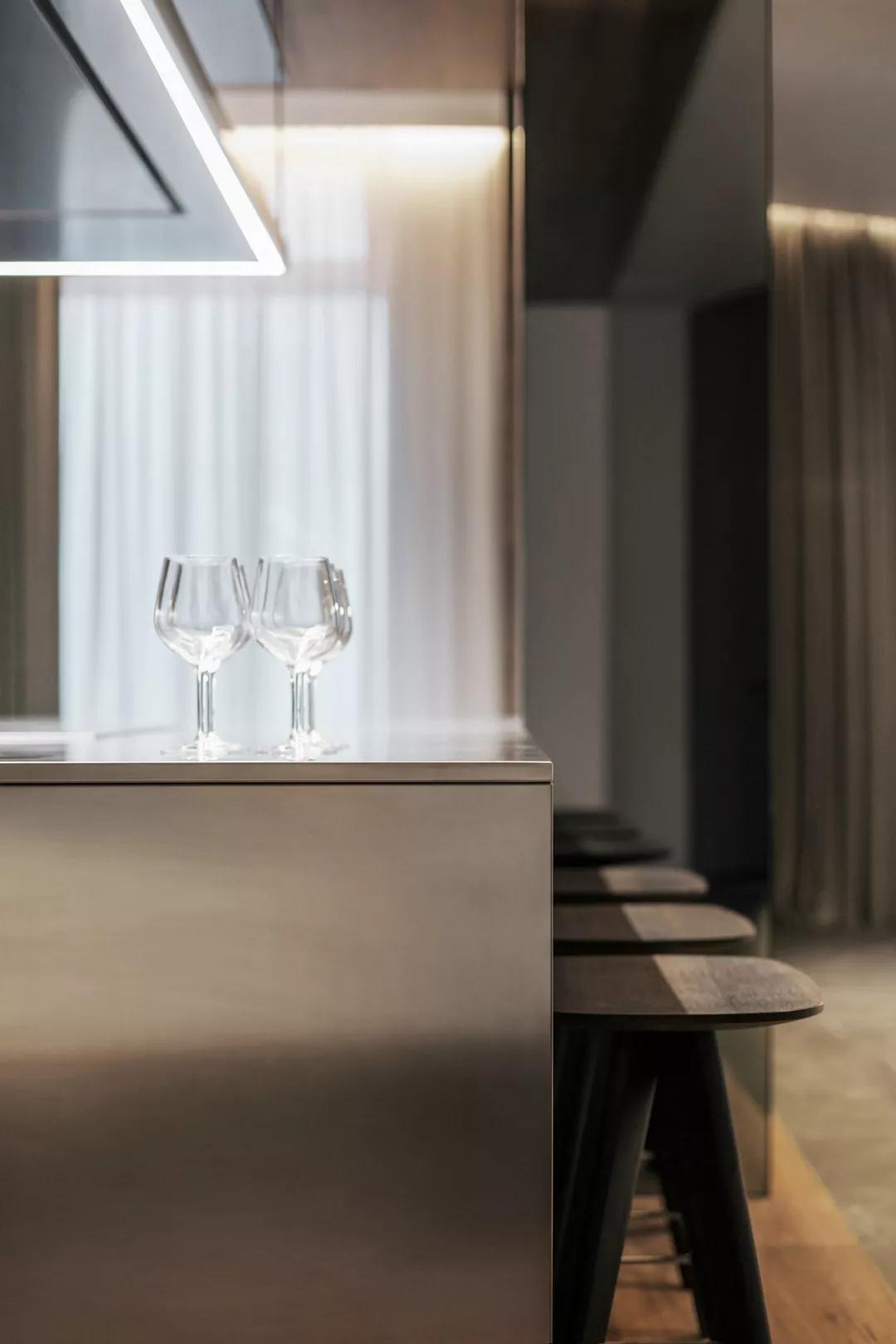 黑色同時也運用在了部分家具之上,因此與相連接的廚房中的黑色家具相互呼應,頗為有趣。整個一樓空間沒有任何實體門的出現,保證了完整的通透感。