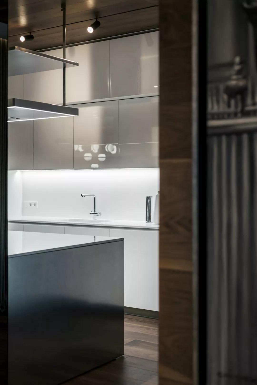 廚房空間中,整面的白色漆面收納墻不僅將冰箱隱藏于其中,同時也將其他電器雜物收拾得一干二凈,甚至連抽油煙機也是隱藏式的,空間中連煙道都完全看不到。