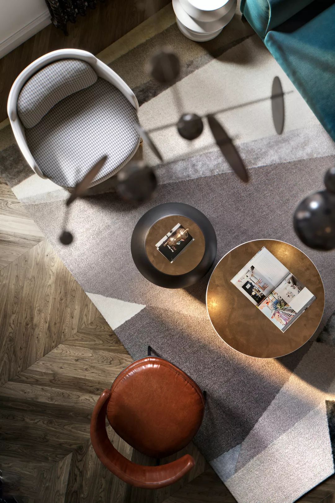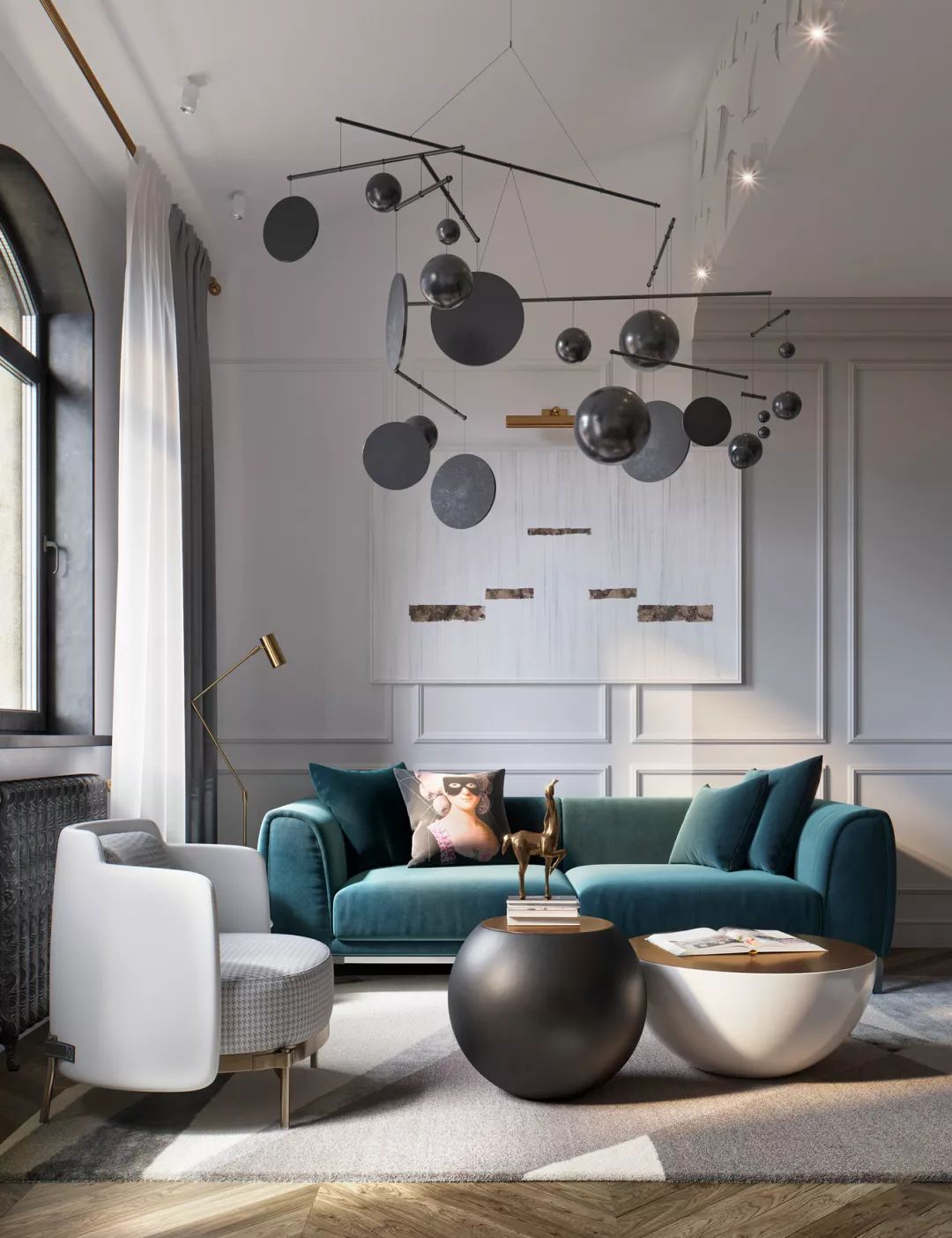 客廳空間充滿了精致的裝飾元素,兩個對比鮮明的定制擺件組合,增加了空間的質(zhì)感。