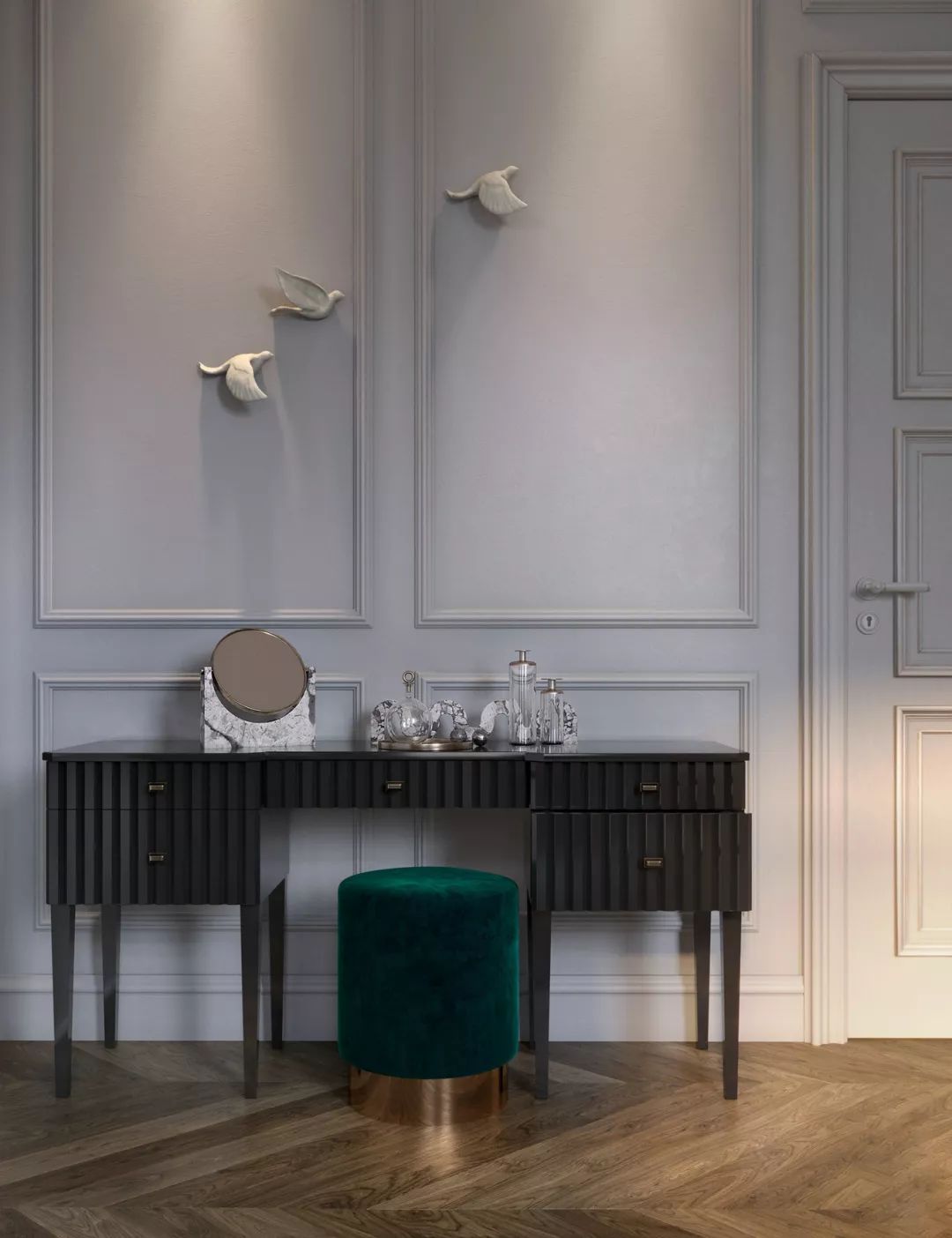 公寓的兩間浴室,延續(xù)了輕盈和飛行的主題,通過飛鳥的形象表達(dá)。