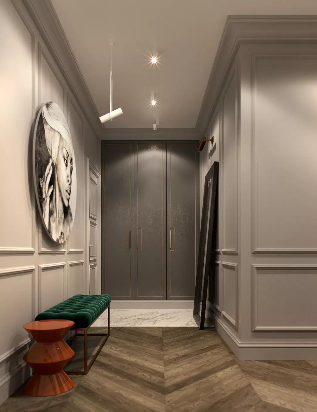 房間內(nèi)部的單色基礎(chǔ)由深綠色和深紅色組成。天鵝絨床的華麗床頭板與石膏組合的輕質(zhì)墻壁背景相映成趣。
