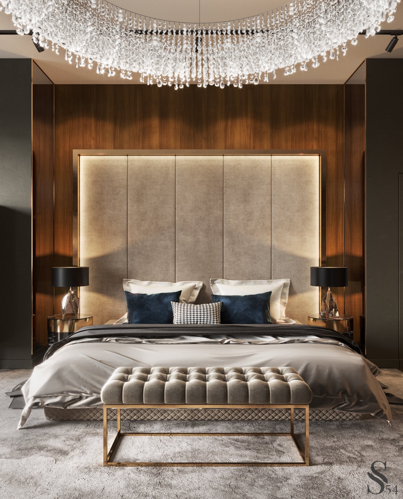 不僅浴室分為男士和女士,還有更衣室,讓他們的主人通過思考他們的圖像感覺盡可能舒適。飽和的高貴木材顏色與儲物柜和門的精致皮革前面相結合,引人注目。 優雅的Serip吊燈在這個豪華實用的更衣室中與島嶼構成了愜意浪漫的視覺效果。