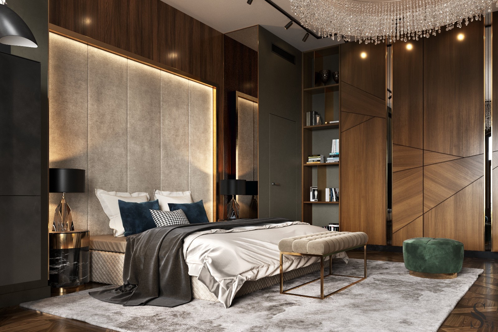 主臥結合了堅固的木質墻板,寬大寬敞的壁櫥由深綠色和灰色的框格組成,由黃銅框架加固。 床上配有天鵝絨床頭板,是定制的,配有優雅的桌子和Eichholtz燈。