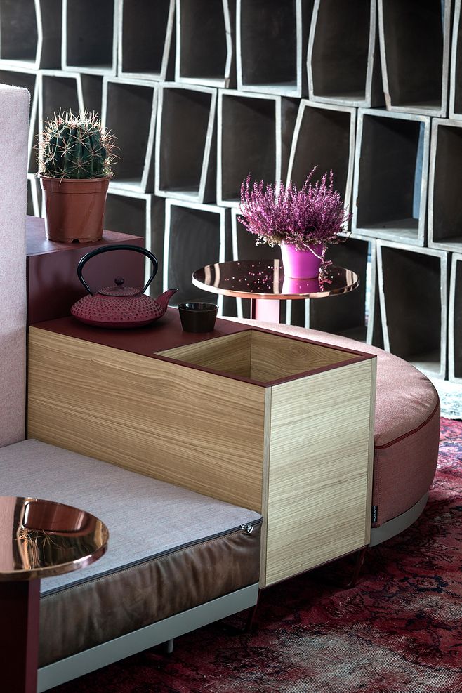 MOROSO的Bikini Island 沙發,是由多個色塊組成的多功能區沙發,深淺蜜桃色的運用,讓人想到日落時分的彩霞,有一種美好安靜的感覺。
