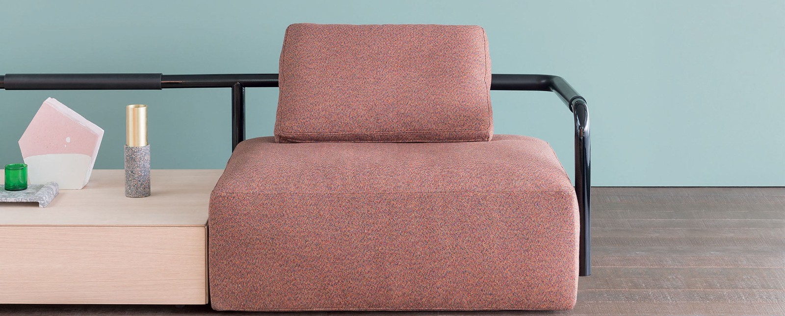 Cassina的503 SOFT PROPS沙發用黑色金屬管將柔軟鏈接起來,形成了一個保護邊界。蜜桃色軟墊配黑管的運用,讓人聯想到女性雖外表堅強但內心柔軟。