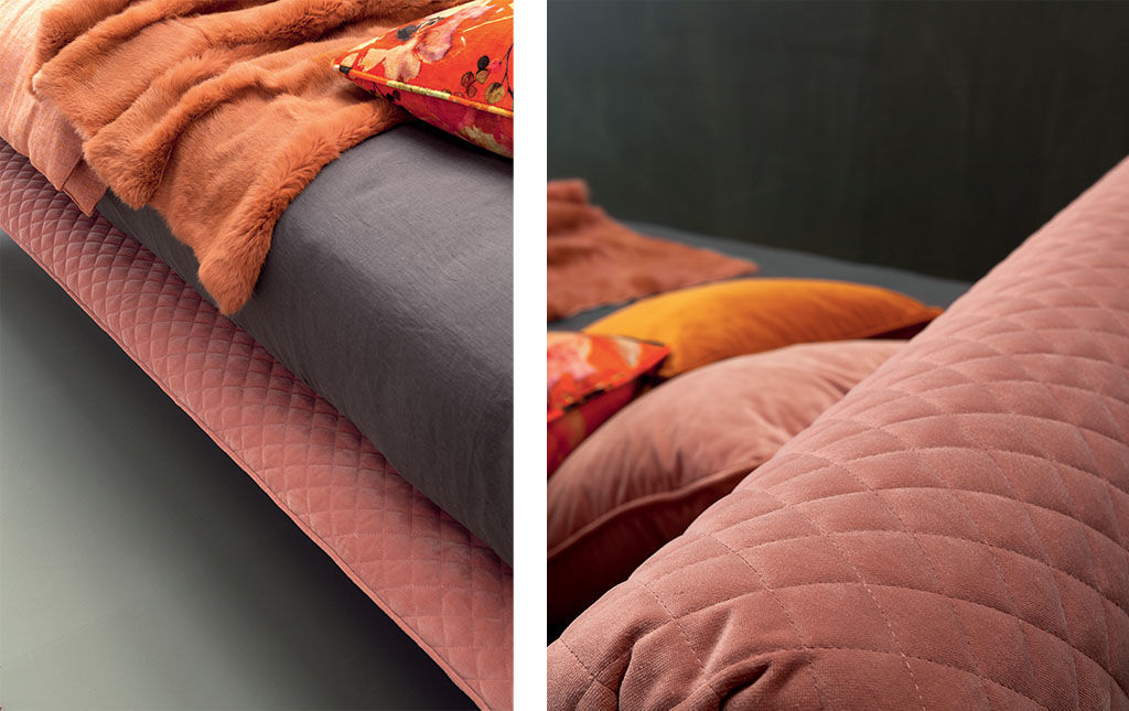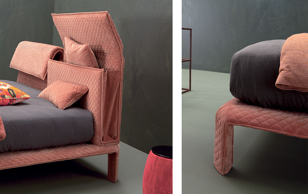 TWILS的POCHETTE床用蜜桃色軟墊包裹床身和靠背,桃意滿滿。晚上在這樣的床上入睡,夢都會是蜜桃味的吧。