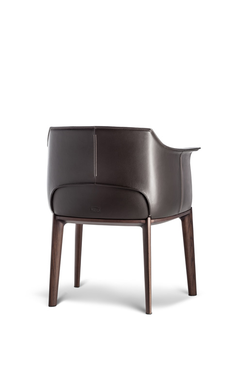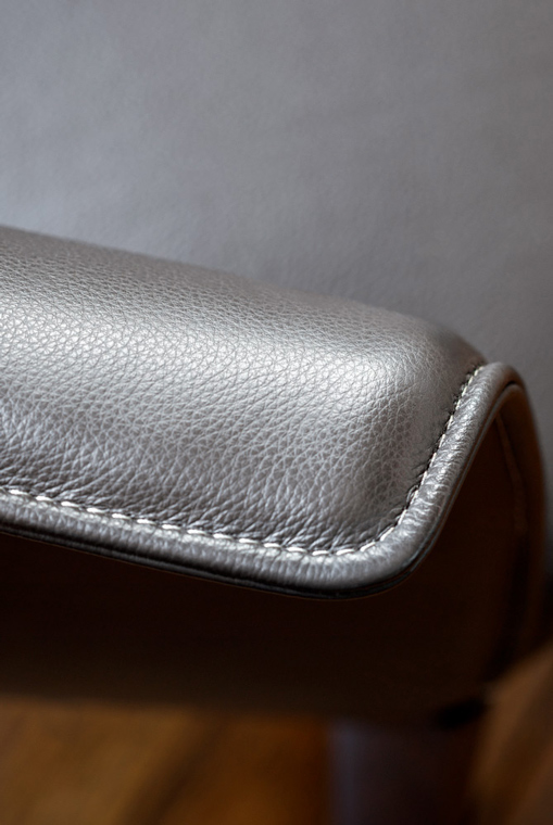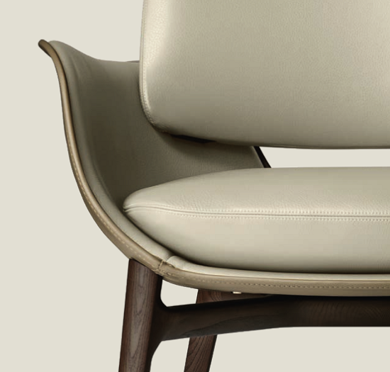 Archibald餐椅具有當代的雕塑感,皮革在縫紉元素下變得柔和。扶手好似襯衫衣領,略微張開,展現細膩又極為考究的灑脫感。珍貴的對比色縫線,巧妙而低調地突顯靠背與外形輪廓的曲線。