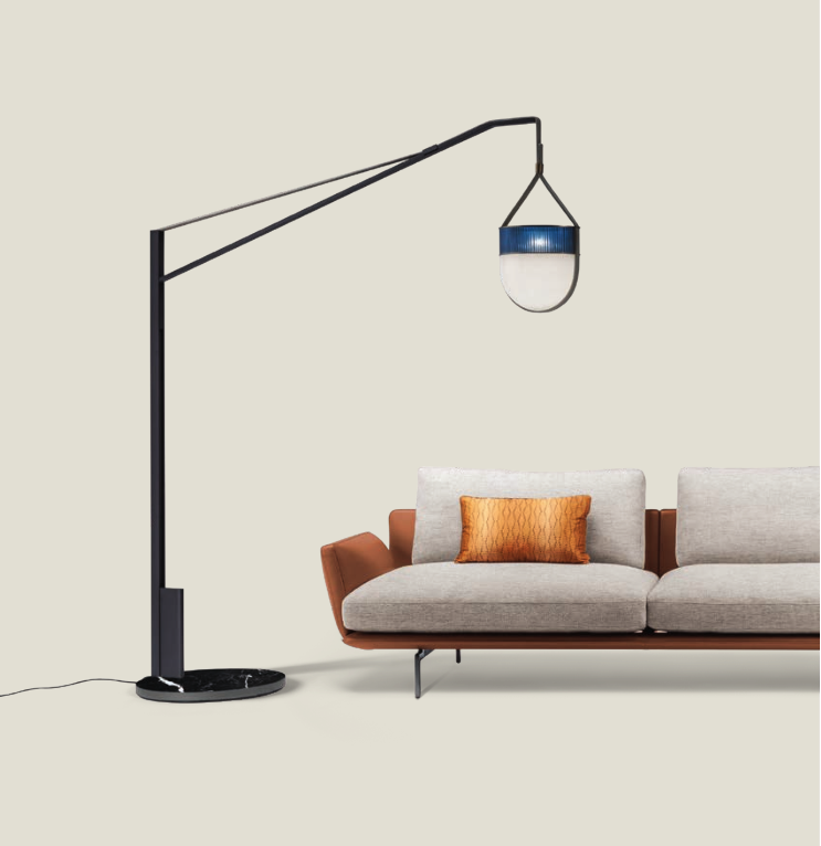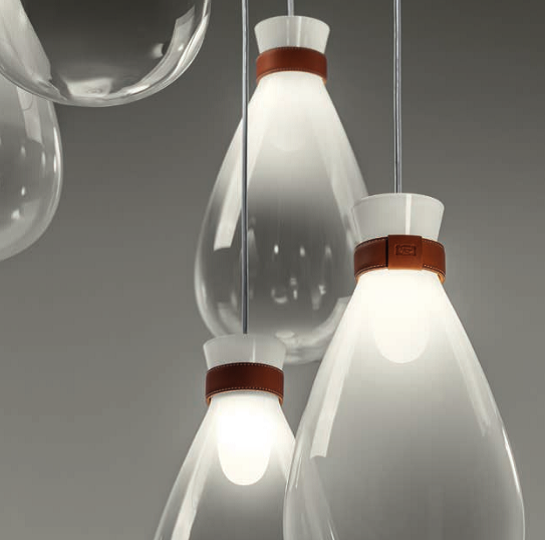 Soffi燈具同樣采用了吹制玻璃工藝,設計師GamFratesi采用了精妙而不規則的球體,像從纖細的鞣皮支臂中流出,借助重力懸在空間中。