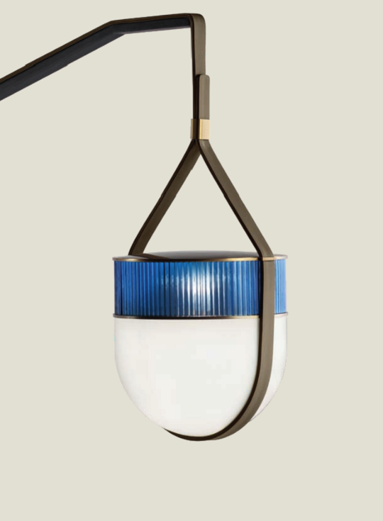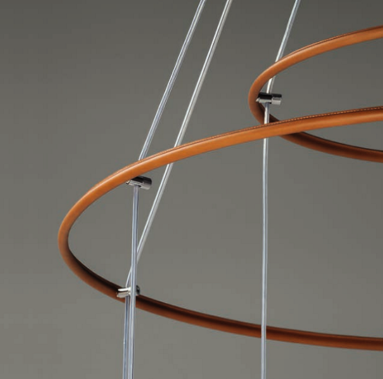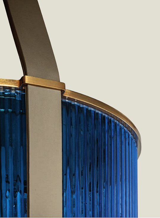 Xi燈具采用吹制玻璃和鞣皮制作,每一件均獨一無二。發光體由兩個吹制玻璃元素構成,上半部分具有特殊的規則而透明羅紋表面,染上琥珀、綠寶石、紅寶石或月光石色。發光體下半部分采用珍珠表面處理,令光線溫暖而分散。