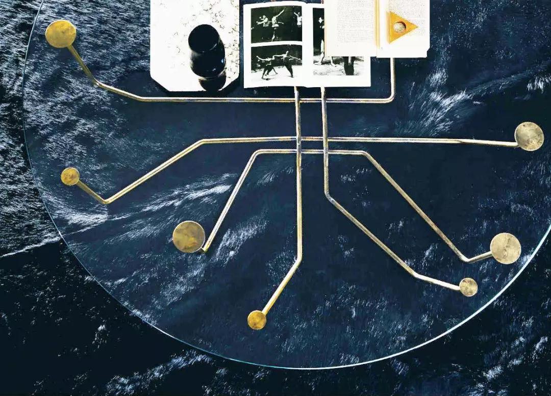 Golden Moon咖啡桌是一眼看到就驚艷的設計,將亮面的黃銅盤子鑲嵌在玻璃平面上,像一個金色的月亮倒影在水中,營造出一種文藝又風雅的家具美學。