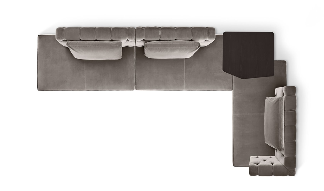 Fiona沙發依舊用了奢華感十足的天鵝絨面料,靠背上的英式紐扣結增添了沙發的設計感,實木的拐角茶幾又增加了實用性。