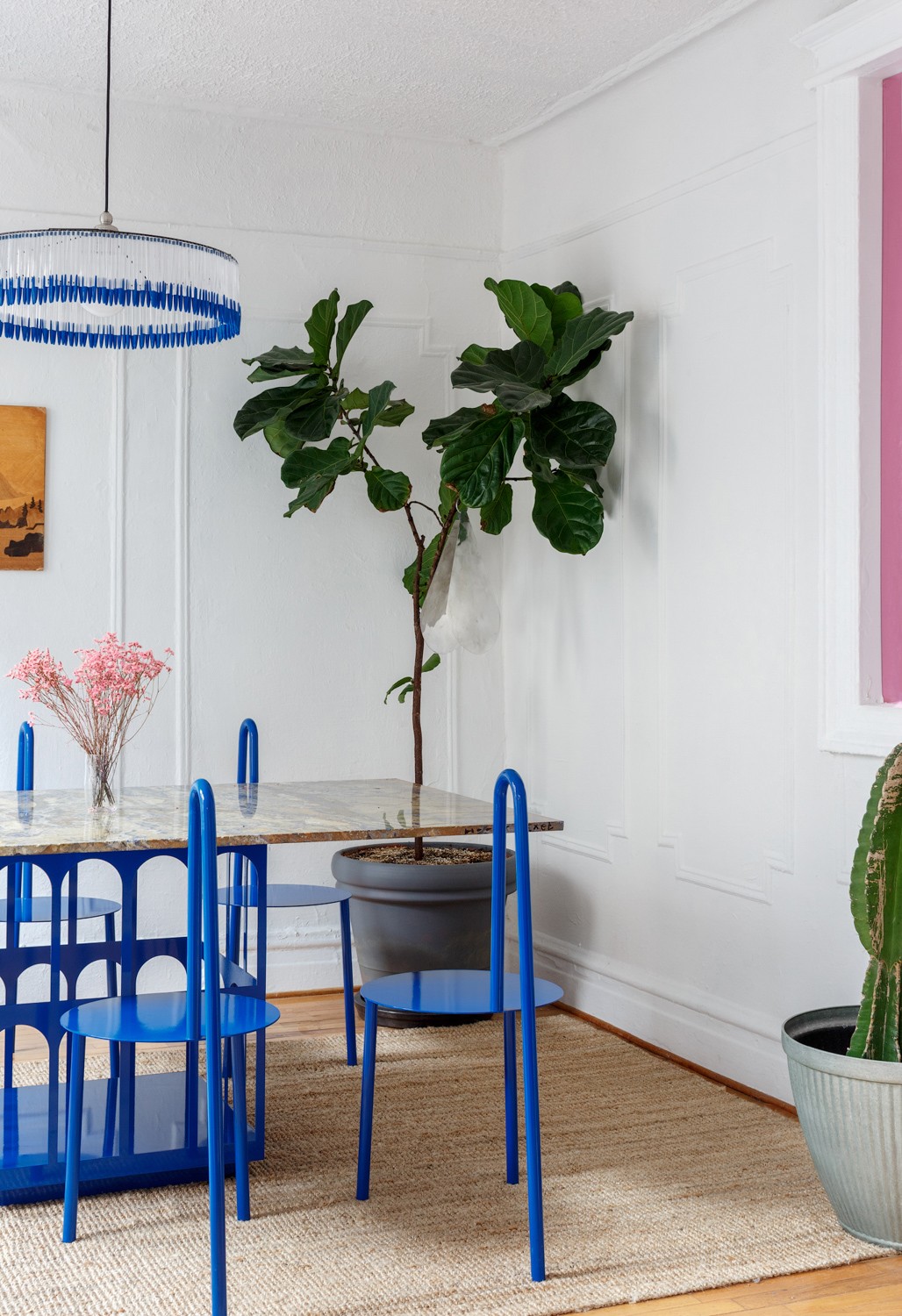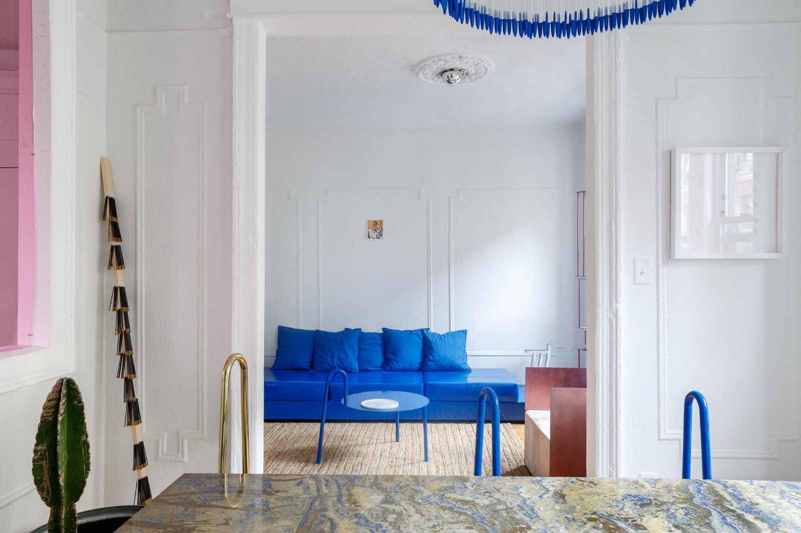 在臥室的設計中總會出現(xiàn)藍色的身影,自帶安靜濾鏡的它,是最助眠的顏色。大片的道奇藍十分富有戲劇性,藍色花邊的燈和抱枕讓空間看起來和諧統(tǒng)一。點綴的粉色色塊讓空間呈現(xiàn)了不同折面的裝飾效果,同時也為過于理性的藍色增加了感性色彩。