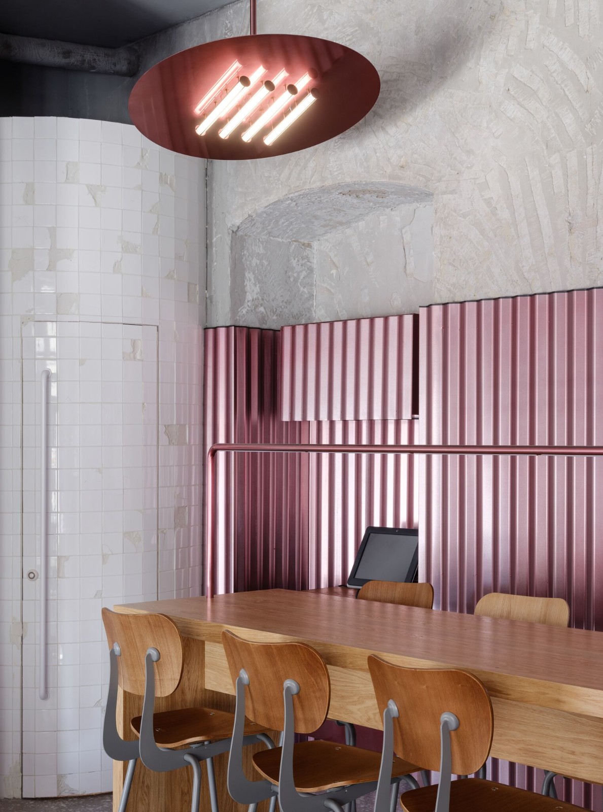 彩色的空間總是處處洋溢著生機與活力。以粉色作為底色的空間是個養(yǎng)眼的設計,通過顏色飽和度的變化來增加空間的層次感,由彩色色條構成的天花板充滿律動感。綠色與橙黃色的點綴又為這繽紛的空間解了“膩”。