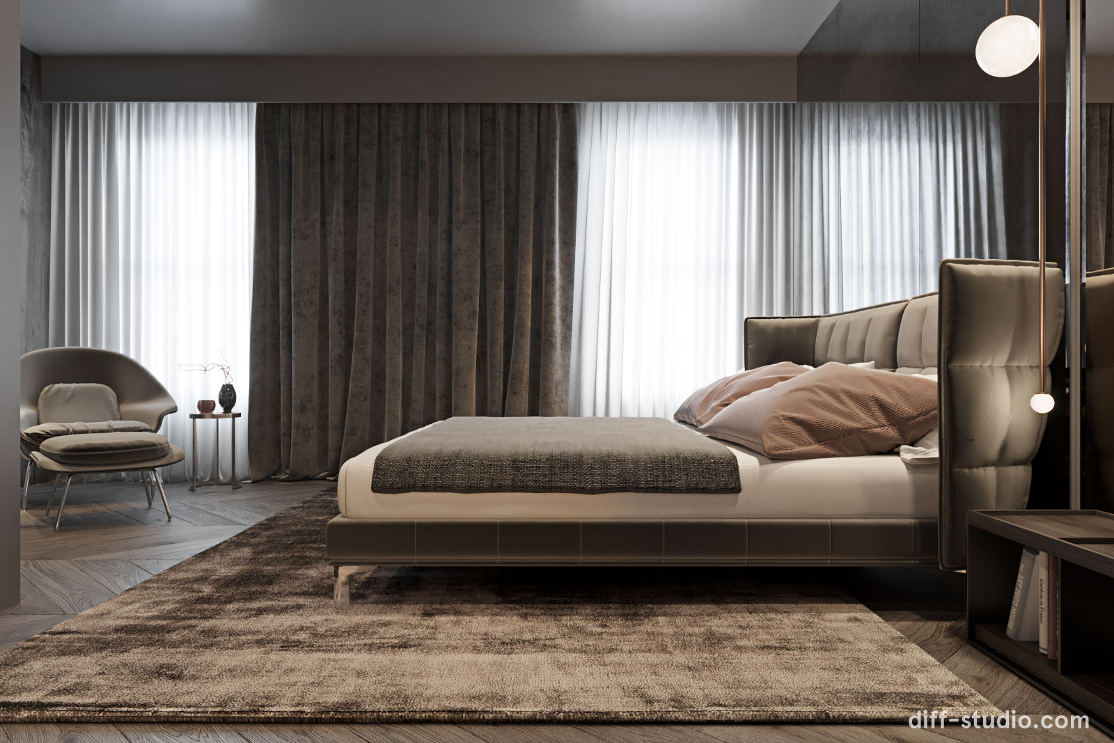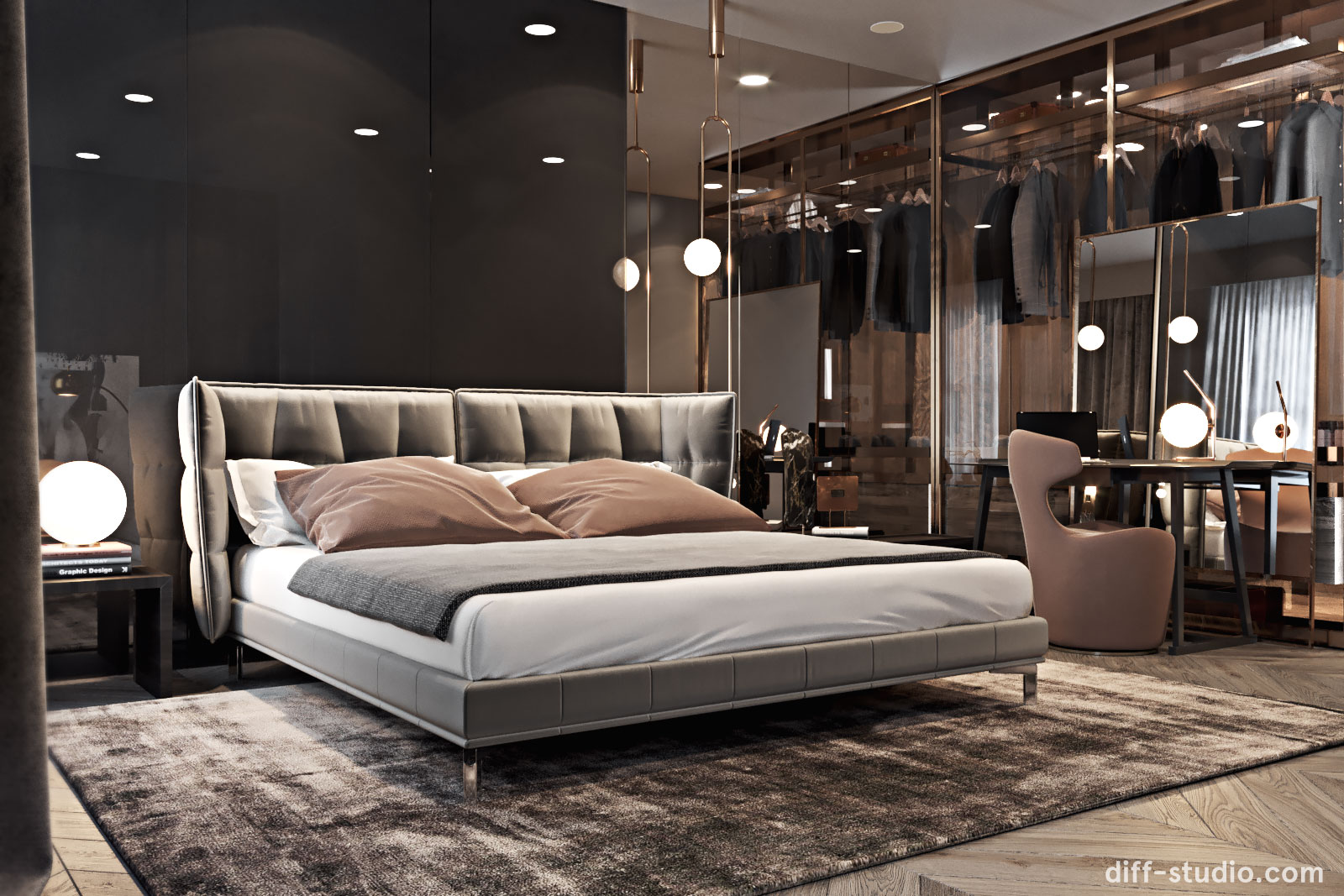 與具有紳士屬性的客廳相比,這個臥室更像是淑女的閨房。成熟內斂的外表下不乏俏皮的少女心。一張高級灰絨面的B&B Italia HUSK床,端莊的坐落在臥室中央,粉色的靠枕與扶手椅相呼應。金屬吊燈從天花板延伸到床頭,將空間高度進行了拉伸,金屬框的衣柜讓臥室與整個空間呼應起來。