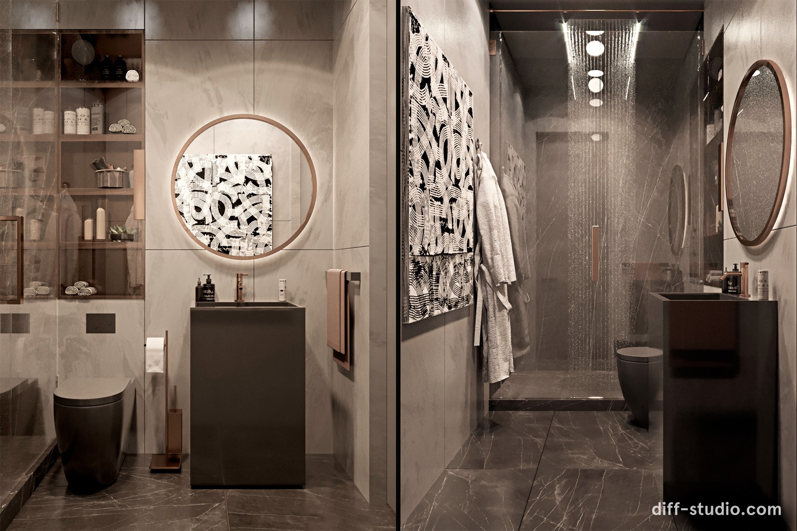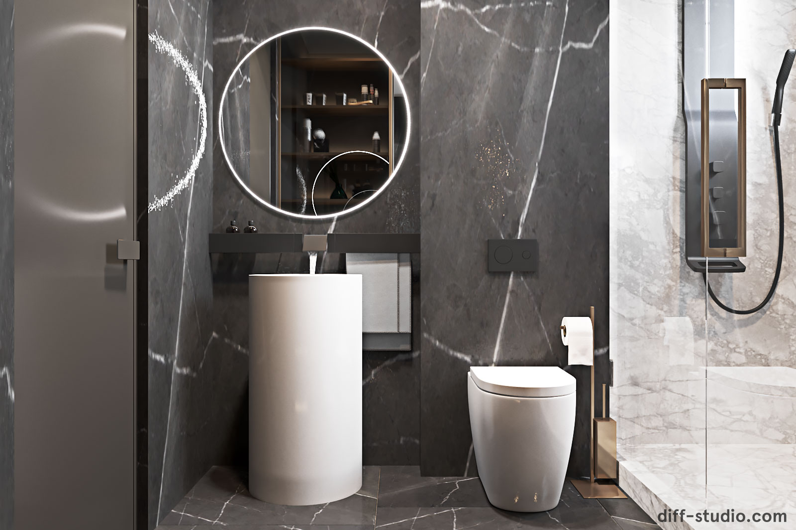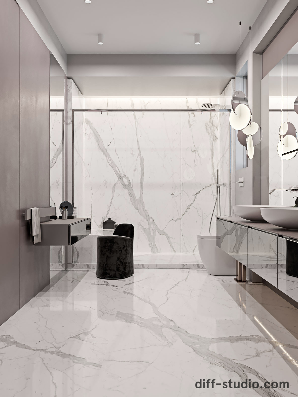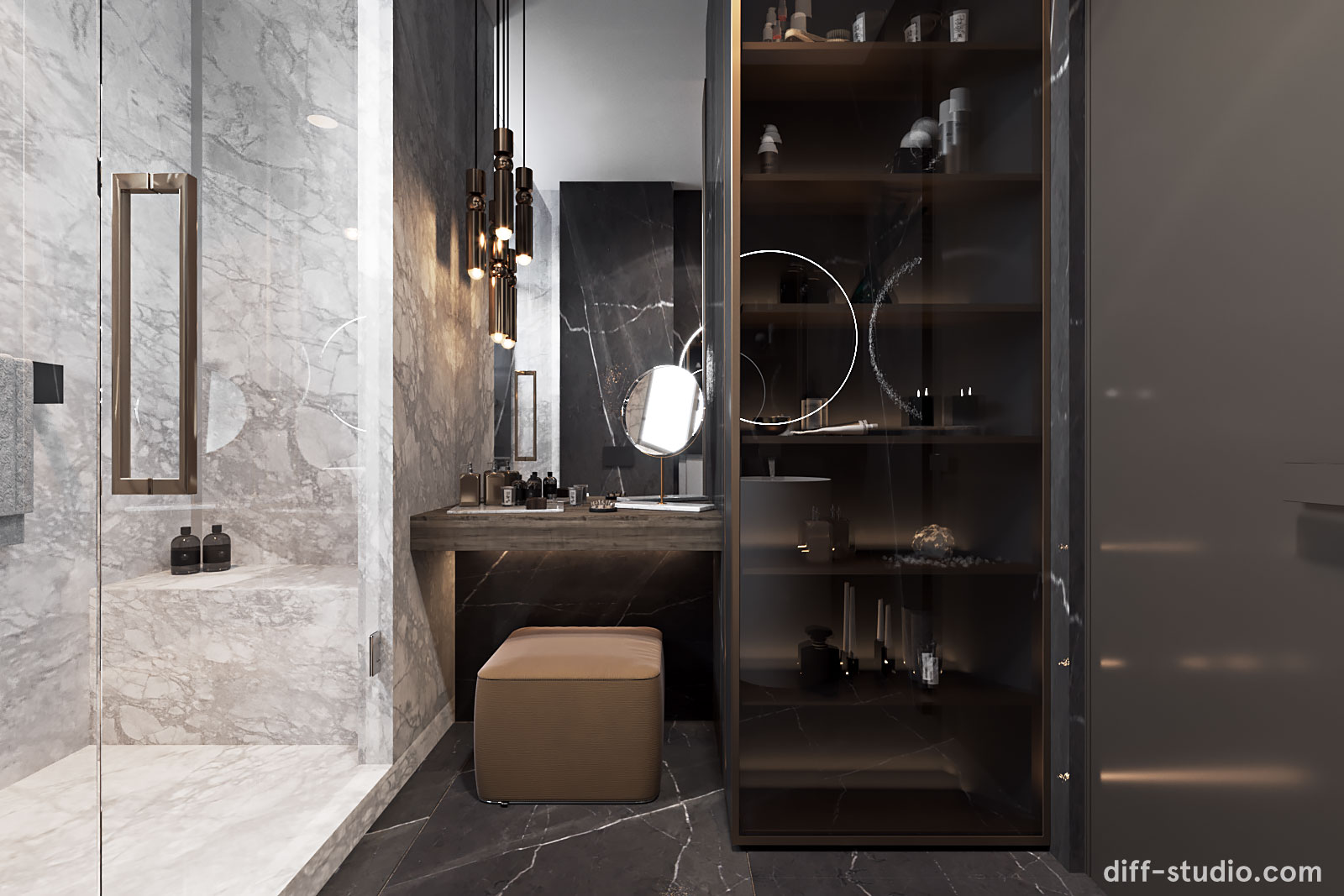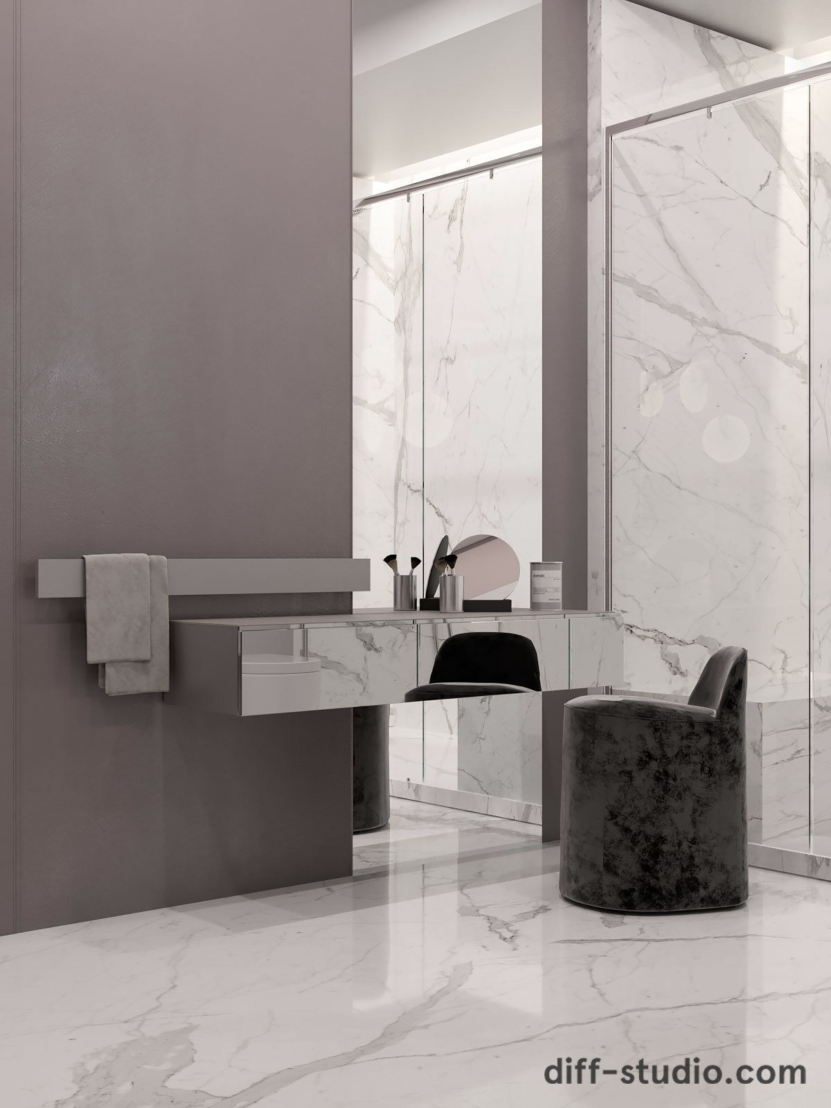 衛浴的設計更加的具有女性特征,帶有灰色調的粉色與大理石地面搭配起來非常清新,深灰色絨面座椅又與臥室形成了紐帶關系。