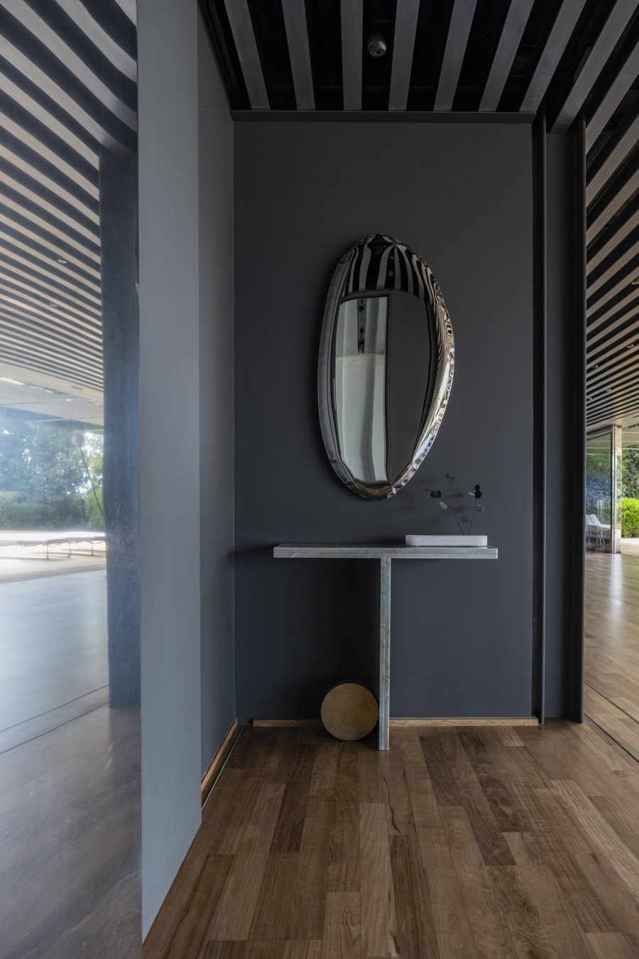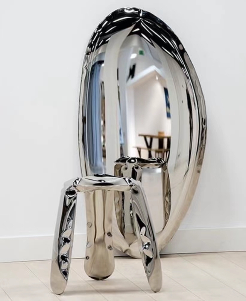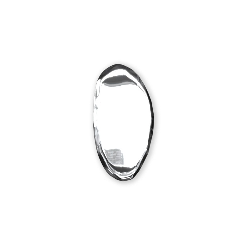 TAFLA O is a series of bionic mirrors of organic shapes inspired by natural shapes of liquid drops. Mirrors from the TAFLA collection are made of stainless steel polished to a high gloss and come in seven different sizes. They can be arranged in an artistic personalized composition or exposed on a wall as a single sculpture-like mirror. They will fit contemporary private spaces, as well as restaurants, bars and hotel rooms. You can enjoy the charm of the classic Inox finish or a colour selected from the available palette. The TAFLA O mirror looks mesmerizing as a single object, but also in layouts that make up constellations of them.
