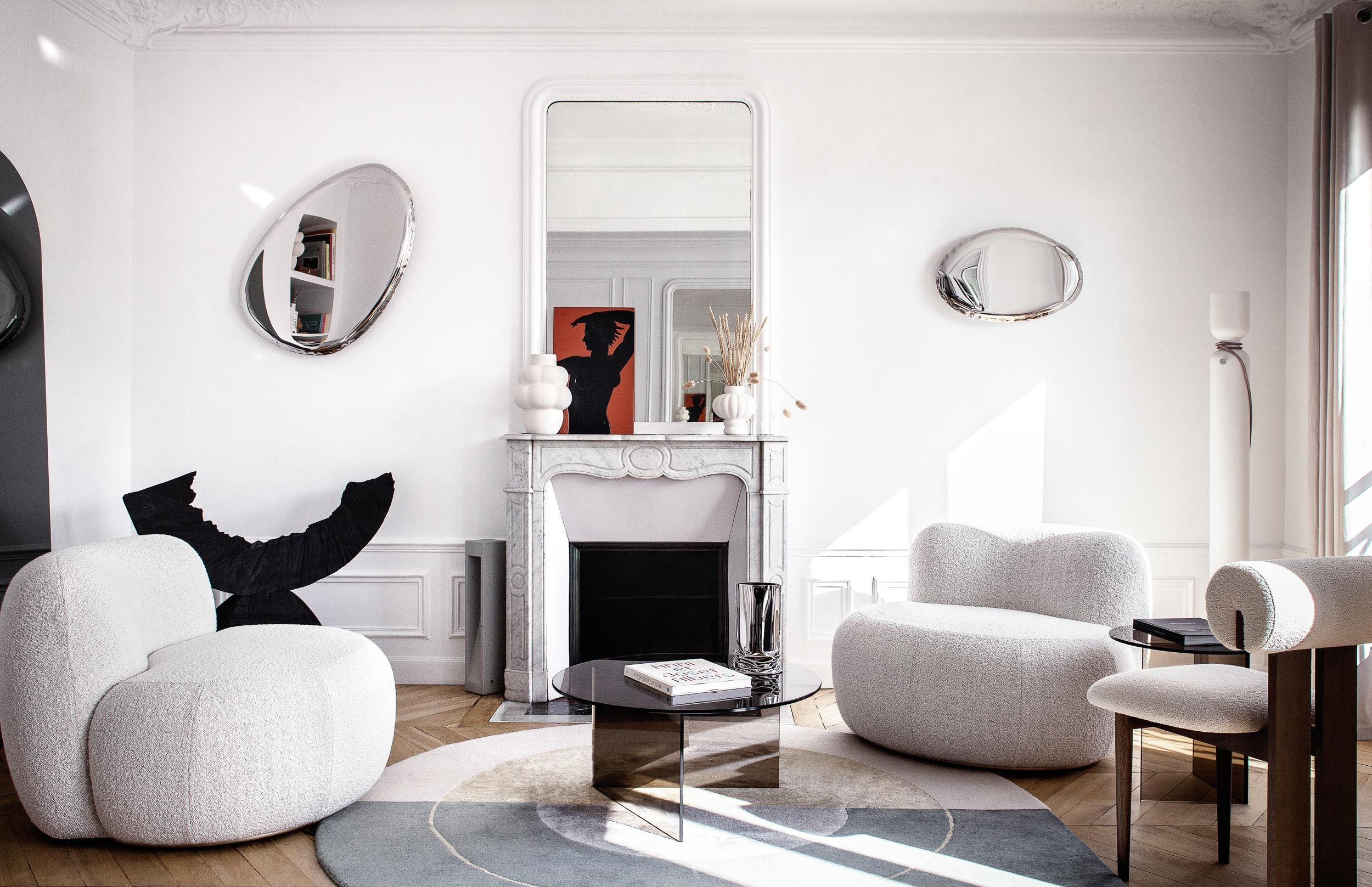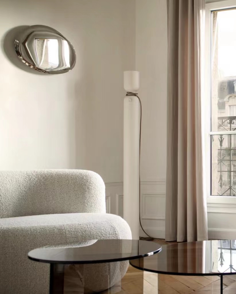 TAFLA O is a series of bionic mirrors of organic shapes inspired by natural shapes of liquid drops. Mirrors from the TAFLA collection are made of stainless steel polished to a high gloss and come in seven different sizes. They can be arranged in an artistic personalized composition or exposed on a wall as a single sculpture-like mirror. They will fit contemporary private spaces, as well as restaurants, bars and hotel rooms. You can enjoy the charm of the classic Inox finish or a colour selected from the available palette. The TAFLA O mirror looks mesmerizing as a single object, but also in layouts that make up constellations of them.